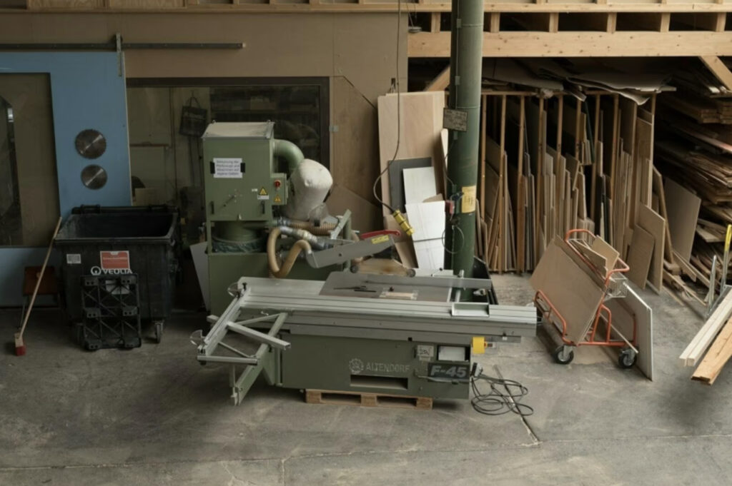 Folgende Maschinen stehen zur Verfügung: Dickenhobel mit Abrichtbank (Kombi-Gerät), Kantenschleifer, Lochreihen-Bohrmaschine (System 32), Rahmen- und Plattenpresse, Formatkreissäge, Plattensäge und Kappsäge.